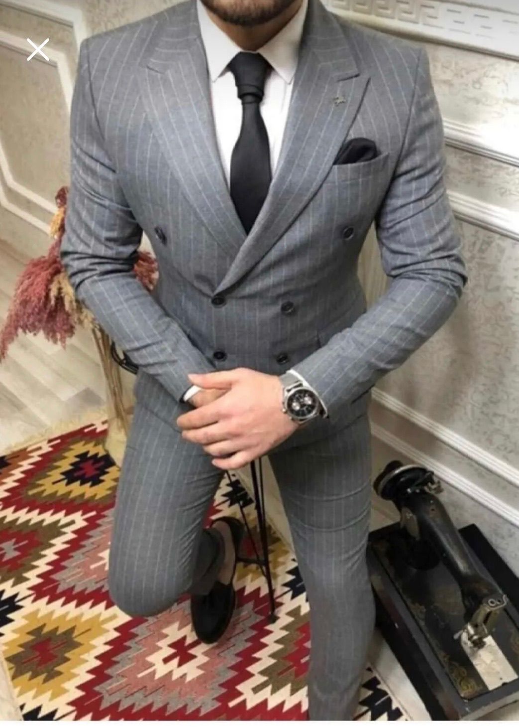Gri çizgili kruvaze takım
